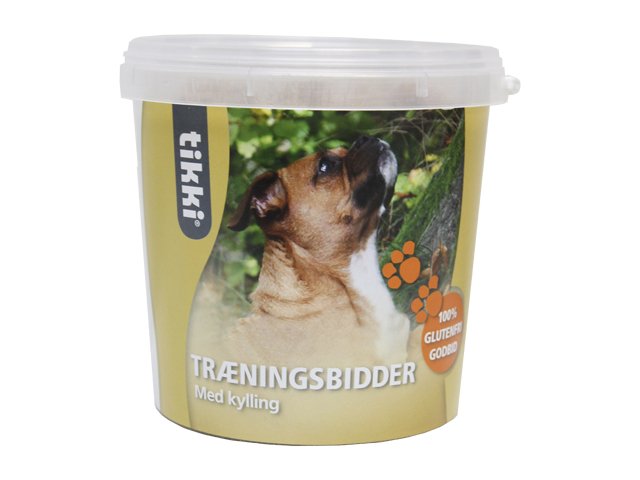 Tikki Træningsbidder leveres i en praktisk spand med låg, så godbidderne holder sig bløde og friske.