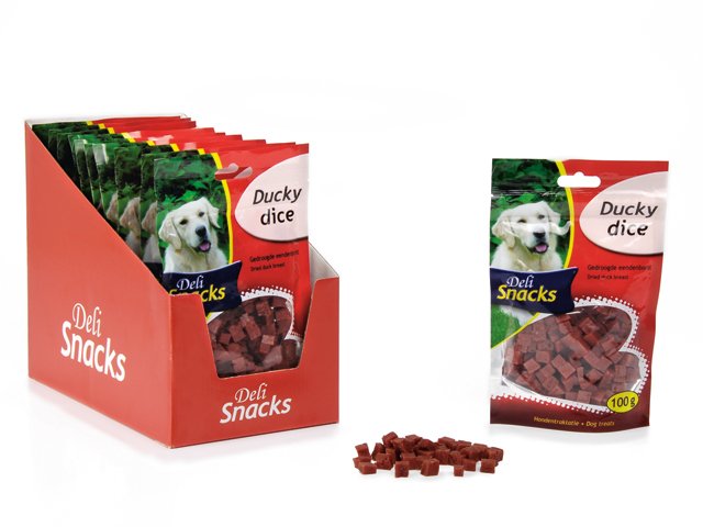 Ducky Dice fra DeliSnacks er lavet udelukkende af andebryst. De er helt bitte små (under 1cm3), og de er perfekte til den hurtige luksusbelønning, som hunden ikke skal bruge tid på at tygge.